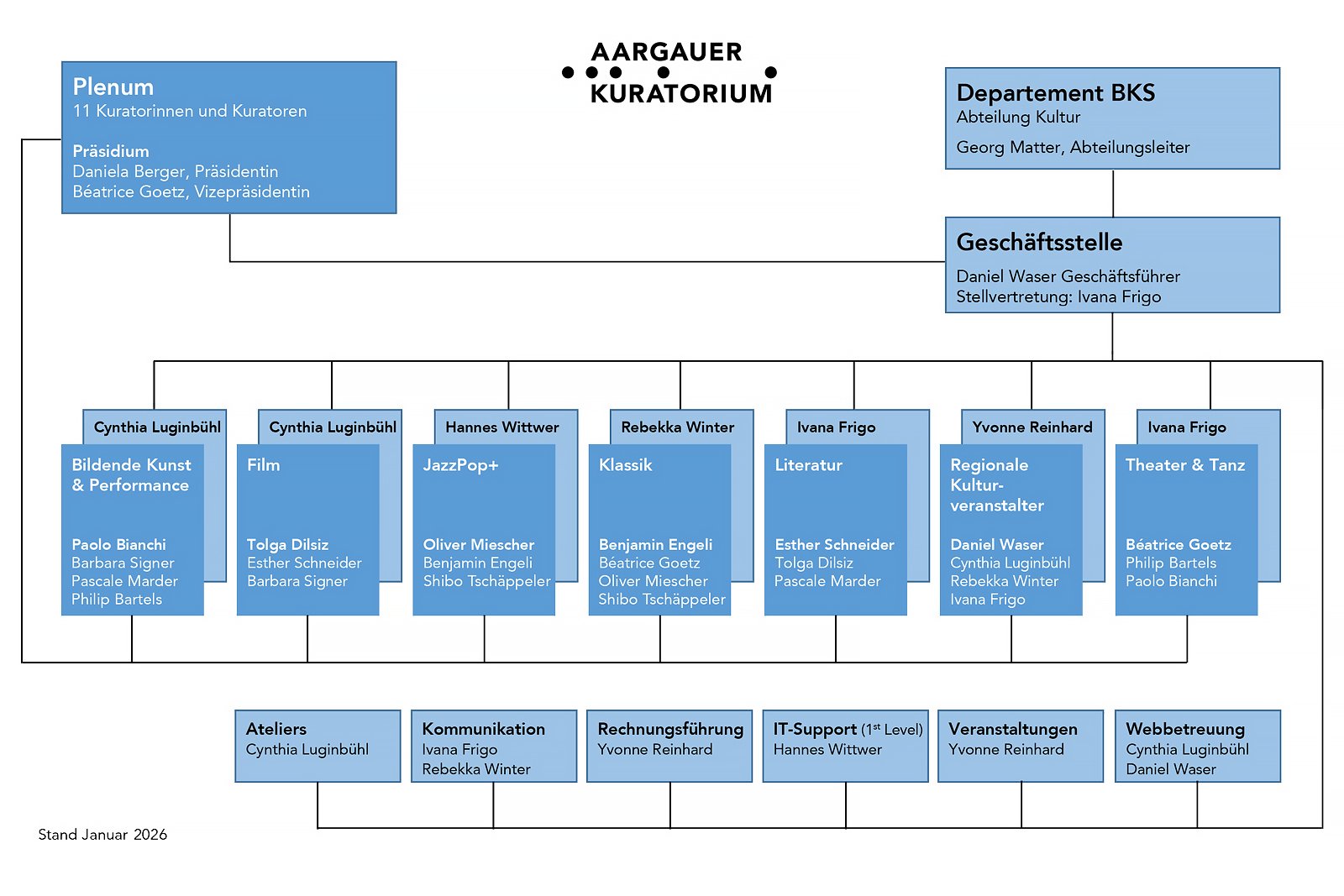 Das aktuelle Organigramm des Aargauer Kuratoriums bietet einen Überblick über die verschiedenen Aufgaben, Bereiche und Zuständigkeiten.
